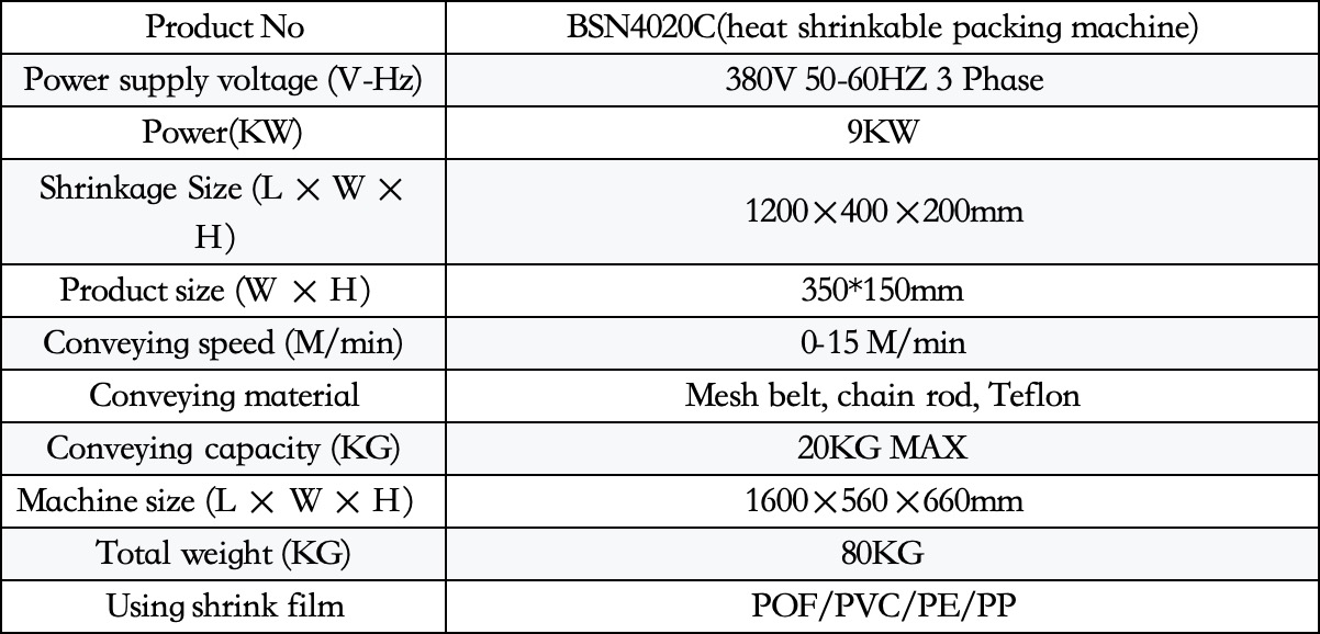 Introduction: BSN4020C far-infared shrink packing machine. It adopts shrink film to pack products,then heat to shrink package material,tighten products. Packed articles can be sealed,damproof,divtyproof and protect thenselves from outside shock&have buffer function.