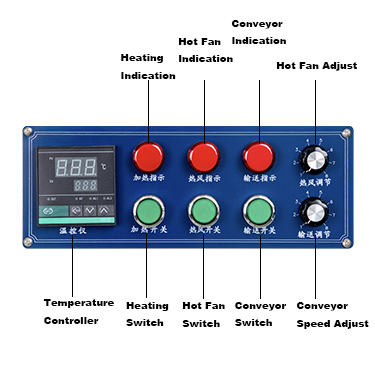 The temperature and the speed of conveyor is adjustable. Can adjust conveyor,heater and wind system individually.